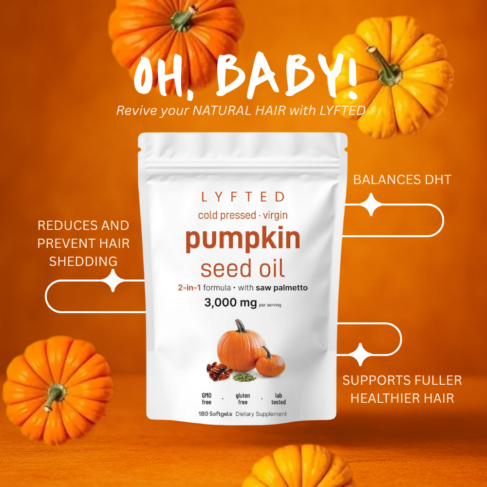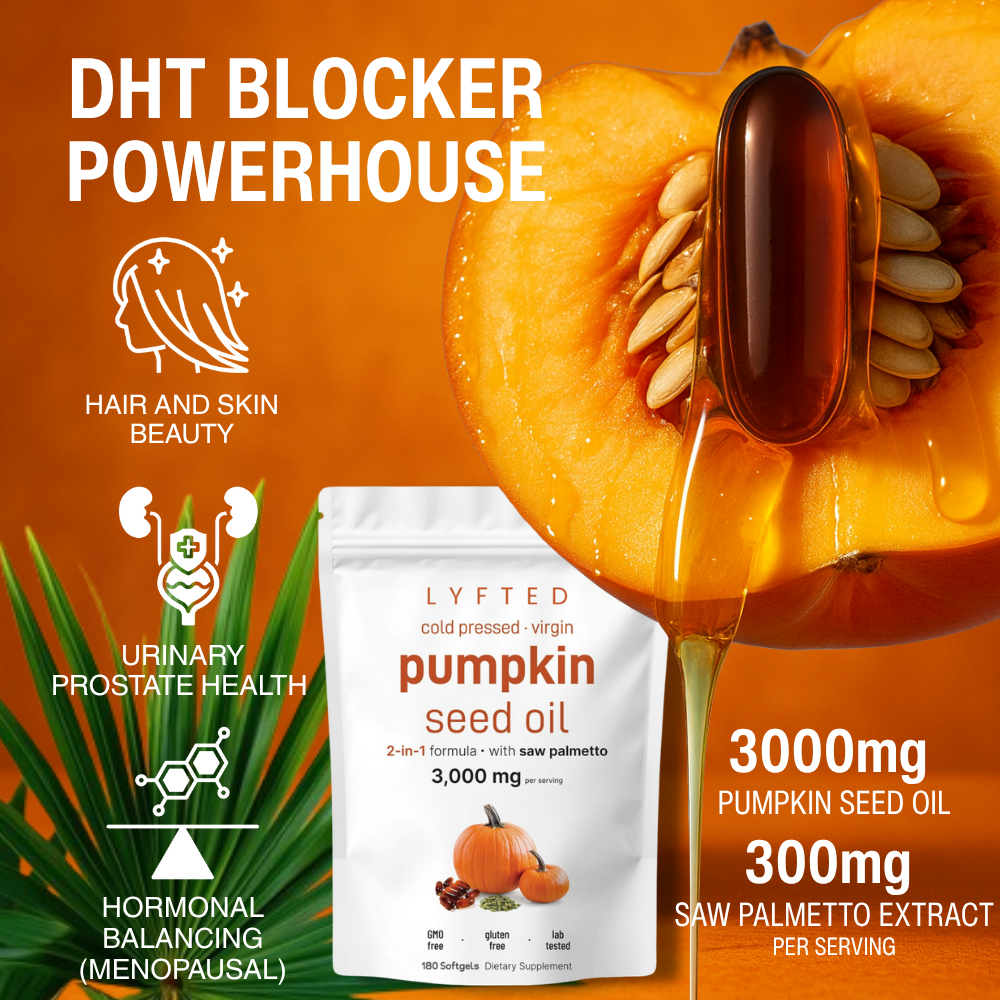 Each serving delivers 3000mg of cold-pressed Pumpkin Seed Oil and 300mg of Saw Palmetto Extract (4:1)—clinically shown to help reduce hair loss, promote growth, and support urinary, prostate, and heart health.