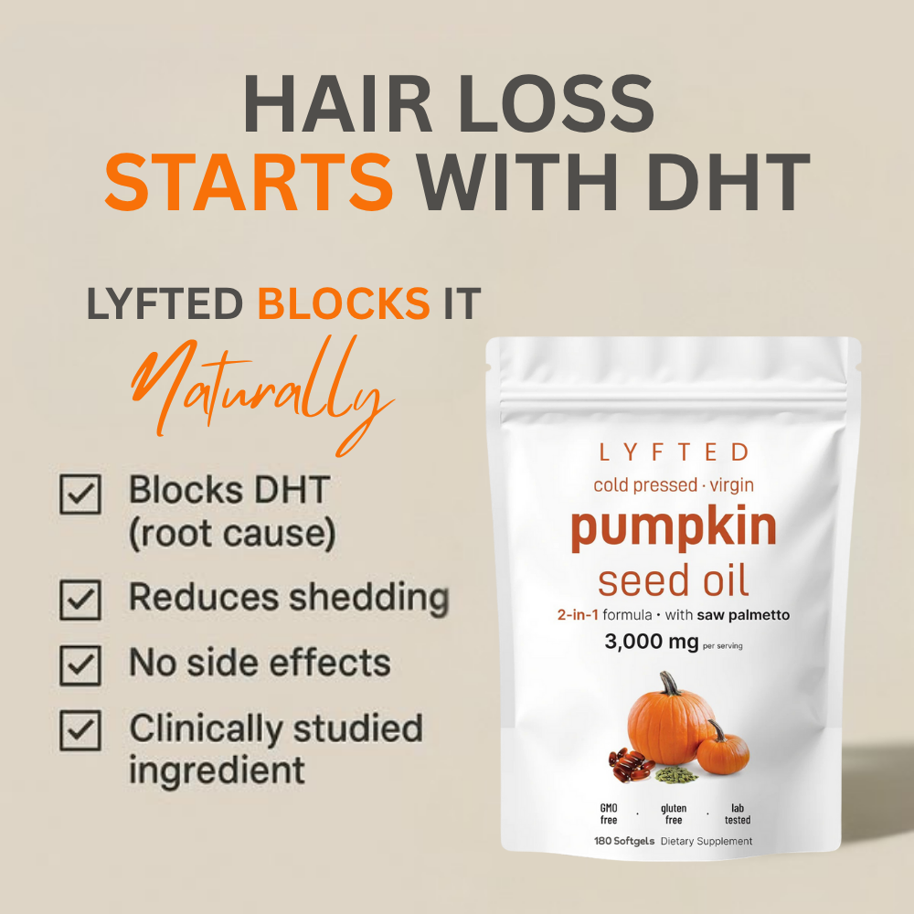 Our Pumpkin Seed Oil + Saw Palmetto Softgels are science-backed and formulated to naturally help block DHT—the hormone linked to hair thinning and urinary discomfort.